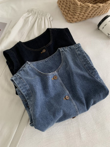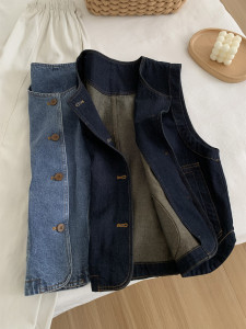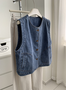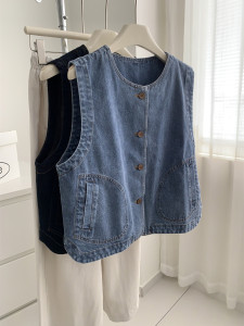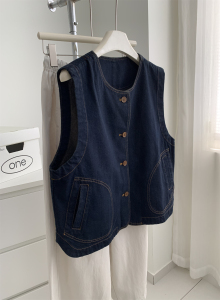 秋季日系复古叠穿短外套女设计感明线圆领纽扣开衫口袋牛仔马甲