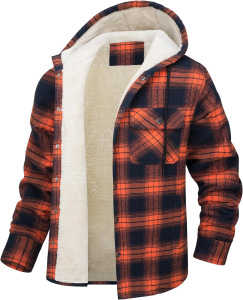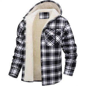 跨境男装加绒夹克亚马逊长袖连帽加绒单排扣保暖格子男士宽松外套