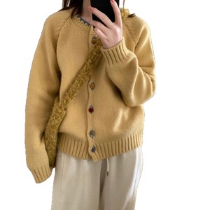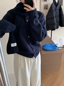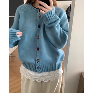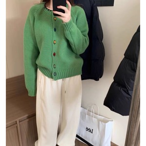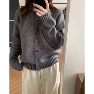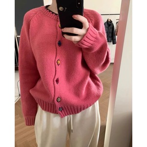 设计感彩色纽扣圆领毛衣外套女秋冬宽松显瘦减龄外穿针织开衫上衣