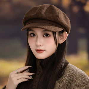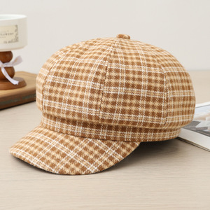 韩系复古百搭格纹贝雷帽秋冬时尚防风保暖八角帽英伦风画家报童帽