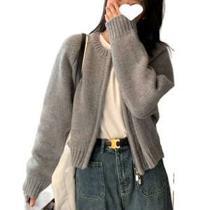 韩系圆领拉链毛衣外套女温柔宽松短款小个子针织开衫上衣