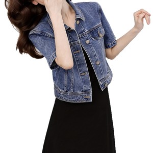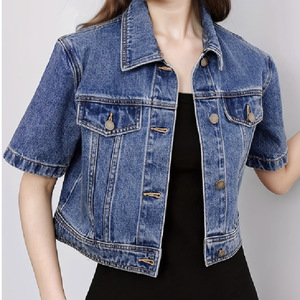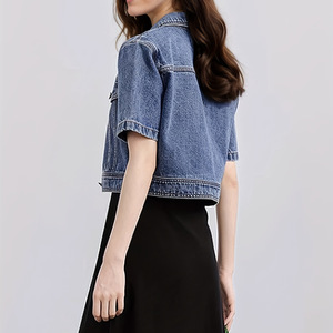 跨境欧美牛仔短外套翻领深蓝正肩跨境爆款深蓝色牛仔布氨纶独立站