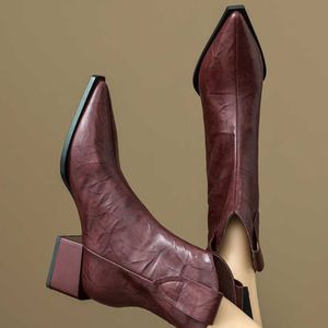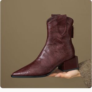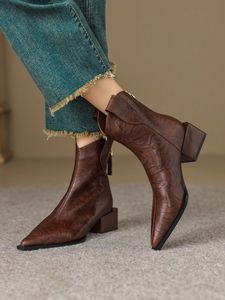 春秋单靴女2025新款尖头超绝中跟短靴粗跟百搭v口西部靴气质女靴
