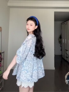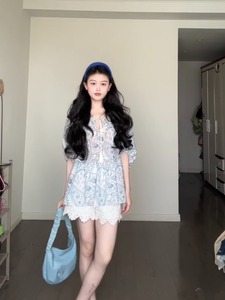 蓝色度假风印花短袖雪纺衬衫女夏季2025新款高级感泡泡袖宽松上衣