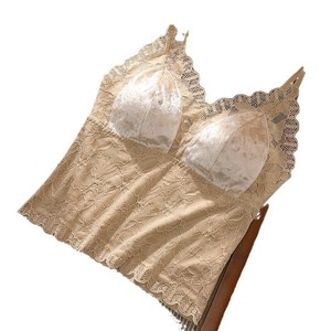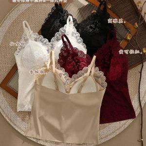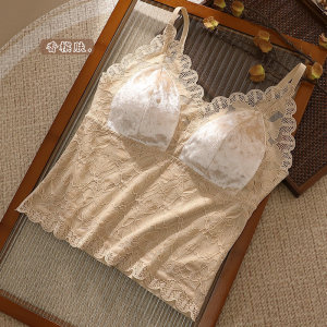 1037法式蕾丝拼丝绒吊带背心一体乳胶杯胸垫内衣时尚内搭美背秋冬