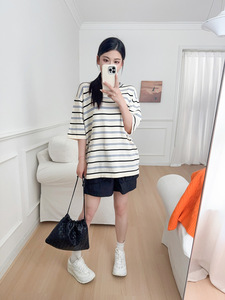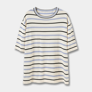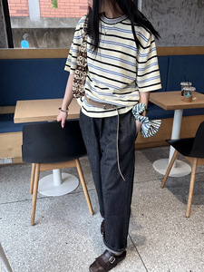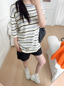Cor25早秋新款蓝黑条纹针织短袖衫宽松圆领T恤女廓形休闲半袖上衣