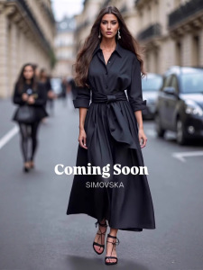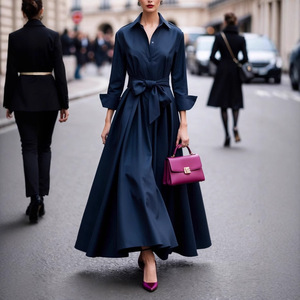 亚马逊欧美2025秋季新款气质翻领长袖连衣裙宽松系带纯色大摆长裙