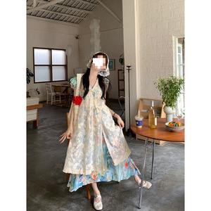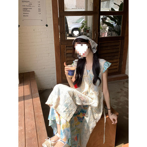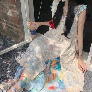 复古套装女彩色油画连衣裙度假风夏季钩花蕾丝罩衫背心裙两件套