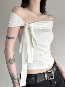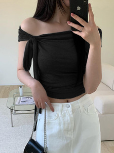 个性设计打结飘带不规则针织上衣女一字领露肩基础纯色修身T恤夏