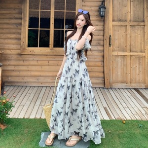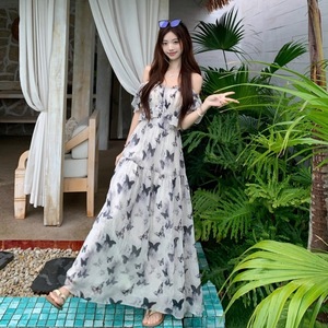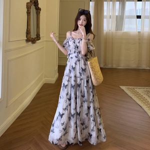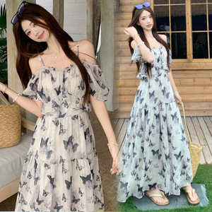 绝美一字肩连衣裙女夏2025新款海边度假穿搭露肩碎花雪纺吊带长裙