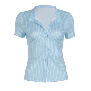 通勤风美式条纹衬衫翻领短袖上衣基础款都市气质女装修身排扣开衫