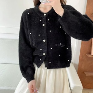 韩系秋冬新款重工钉珠温柔甜美小香风仿水貂针织开衫上衣圆领毛衣