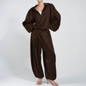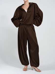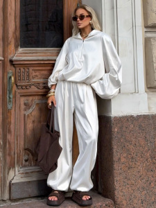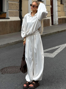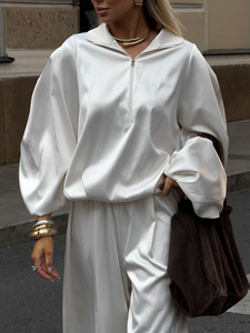 冬季新款运动风V领缎面长袖长裤套装设计感气质休闲2025跨境通勤