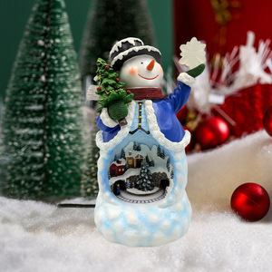 跨境创意树脂工艺品雪人手拿圣诞树电动旋转音乐彩灯LED灯装饰品