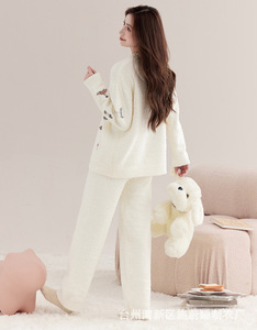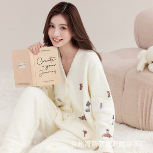 秋冬半边绒软绵绵睡衣可爱卡通刺绣彩色狗狗保暖家居服开衫长裤女