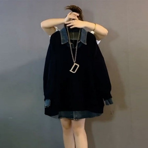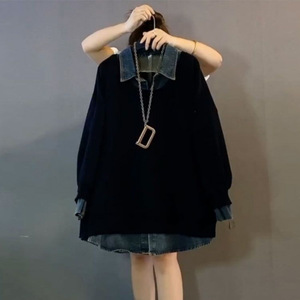 胖MM特大码300斤春秋款韩版宽松休闲polo领上衣牛仔领拼接卫衣女