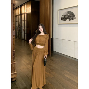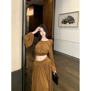 焦糖色蝙蝠袖圆领长袖上衣+抽褶垂感开叉半裙长裙套装女