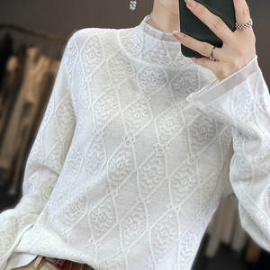 2025半高领针织衫女微透打底衫百搭纯色新款上衣蕾丝镂空女装服饰