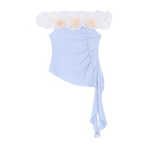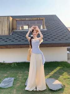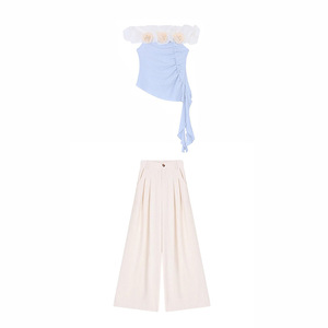 纯欲风套装女夏日新款温柔不规则一字肩花朵飘带上衣阔腿裤两件套