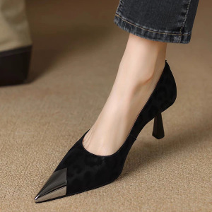 2025年秋季新款法式复古豹纹尖头高细跟浅口单鞋女时尚气质金属头
