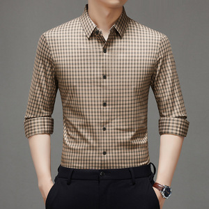 春秋季桑蚕丝长袖衬衫男时尚格子衬衫商务免烫抗皱无痕长袖衬衣男