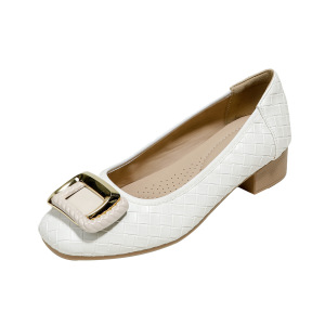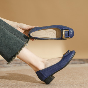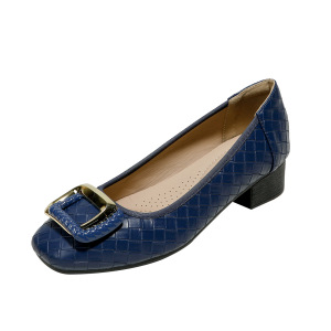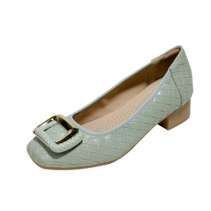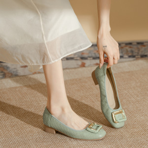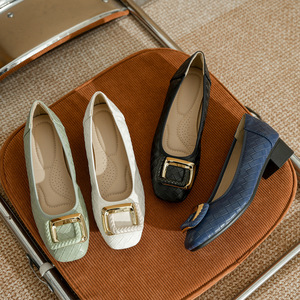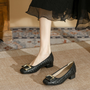 真皮粗跟低跟单鞋女气质方头百搭时尚编织金属方扣一脚蹬软底女鞋
