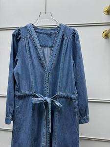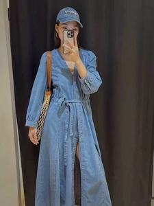 法式小众25年早秋新款复古简约七分袖V领系带中长款牛仔连衣裙女