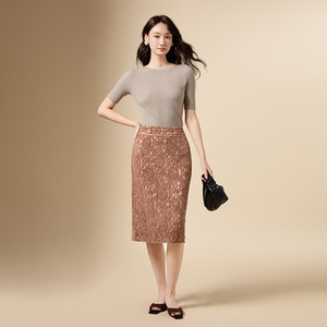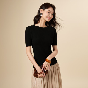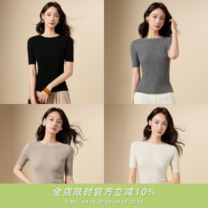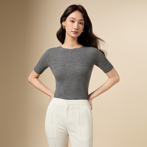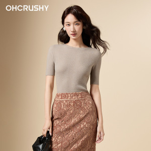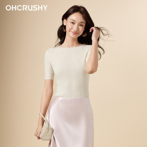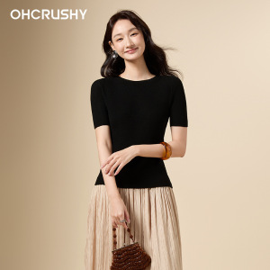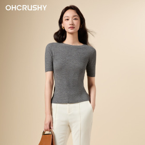 OHCRUSHY 扬子纱精纺全羊毛水波纹小圆领短袖T女气质修身显瘦上衣