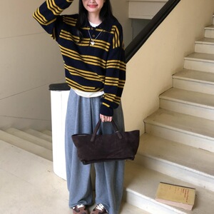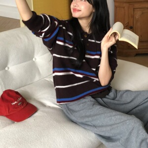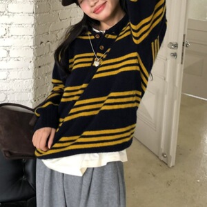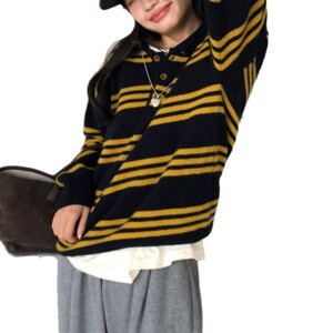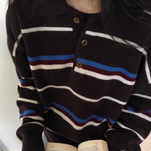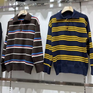 韩系复古拼色条纹毛衣2025新款秋冬毛衣套头polo领针织打底衫女装