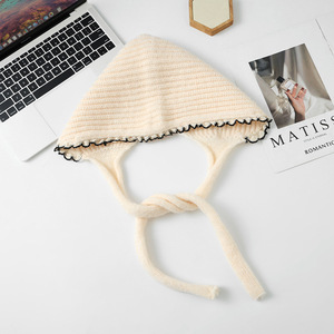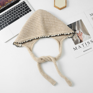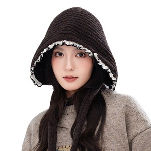 秋冬防寒大头围保暖套头帽复古花边加厚绑带水桶帽防风保暖毛线帽