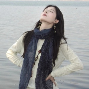 森系文艺复古藏蓝色碎花围巾女薄款褶皱棉麻长款丝巾披肩拍照配饰