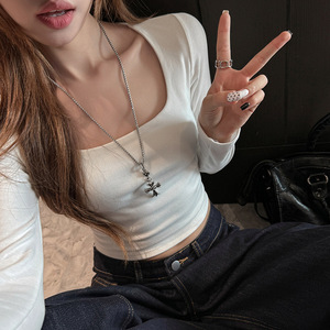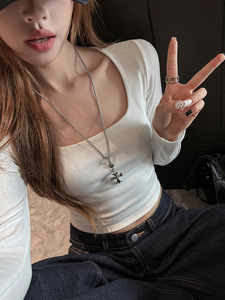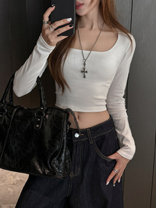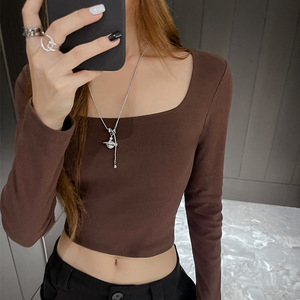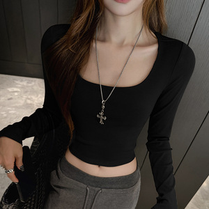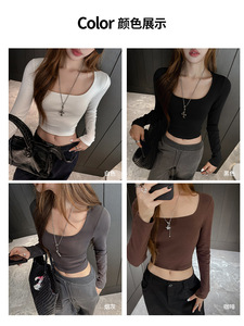 新款方领长袖t恤女秋冬内搭短款露脐打底衫白色修身显瘦正肩上衣