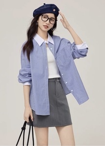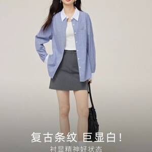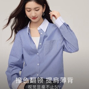 条纹衬衫女2025春秋新款气质撞色翻领休闲上衣