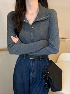 灰色polo领长袖t恤女早春设计感小众修身内搭打底衫正肩针织上衣