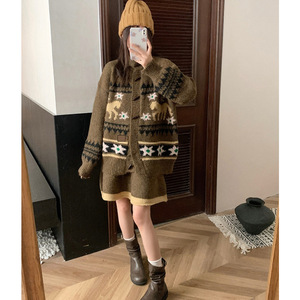 复古费尔岛毛衣开衫女套装秋冬新款提花针织开衫洋气半身裙两件套