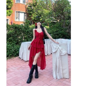 法式气质红色不规则吊带连衣裙女夏季新款辣妹气质度假风海边长裙