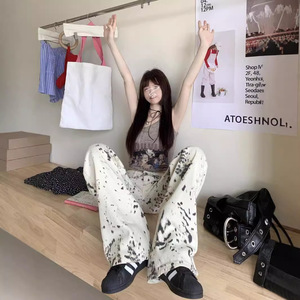 【韩牛】宽松休闲阔腿直筒拖地复古高街辣妹豹纹设计感牛仔裤女