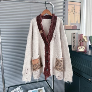 欧洲站撞色宽松慵懒风毛衣外套女秋冬新款破洞设计感小众针织开衫