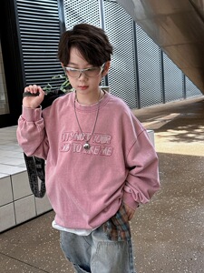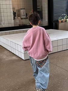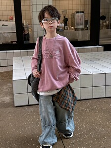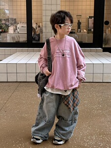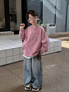 新尔2025秋季新款字母贴布绣炒洗做旧圆领卫衣儿童毛圈上衣男童潮