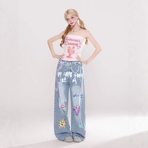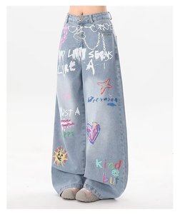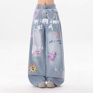 Y2K趣味涂鸦印花牛仔裤女多巴胺休闲百搭显瘦嘻哈甜妹显瘦弯刀裤