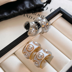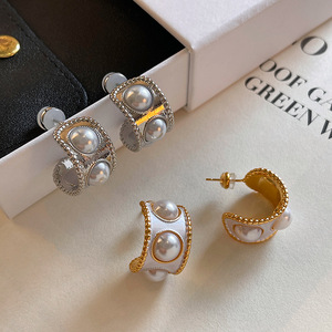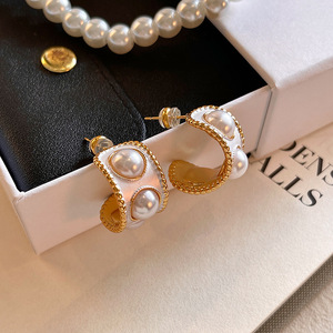S925银针法式复古小香风C形耳环女真金电镀时尚百搭气质珍珠耳钉