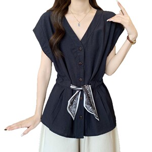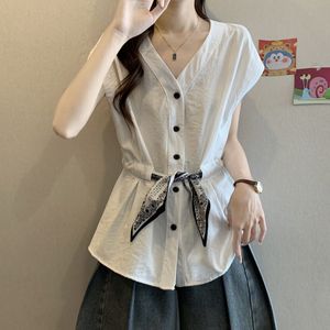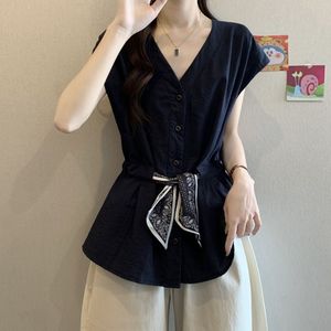 大码韩系简约纯色V领无袖衬衫女夏季新款百搭纯色单排扣丝巾上衣