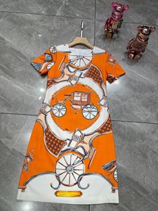 橙色马车印花连衣裙女 2025 夏季新款 短袖圆领中长款 A 字裙