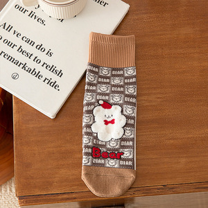 跨境袜子纯棉无骨女秋冬新款棋盘格卡通熊中筒女袜子长直板袜批发