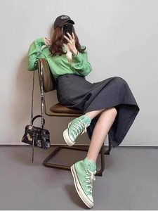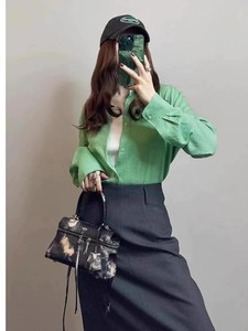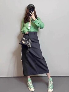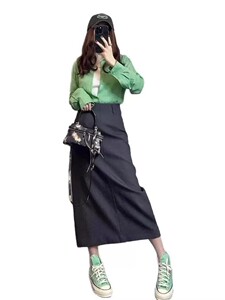 2025超火春装一整套ootd穿搭减龄独特漂亮绿色衬衫半身裙两件套装