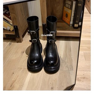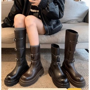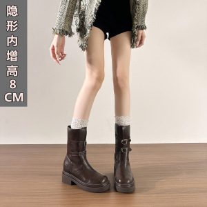 苏茵茵同款厚底长靴女内增高单靴棕色机车靴中高筒扣子靴女骑士靴