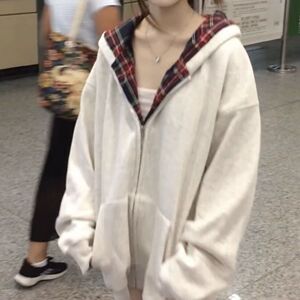拼接格子连帽开衫卫衣女秋冬假两件美式潮牌重磅硬挺拉链开衫外套