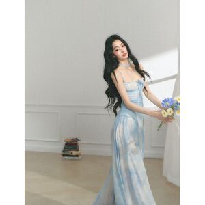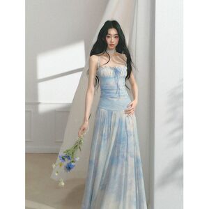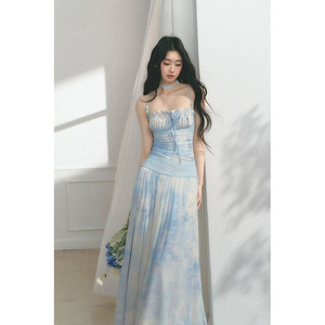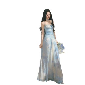 法式甜美风蓝调莫奈串珠设计清新吊带连衣裙夏季新款收腰显瘦长裙