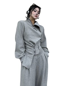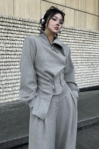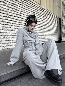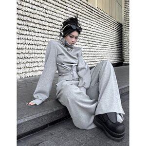 2025春秋新款韩版ins大码小众设计感运动风灰色卫衣阔腿裤套装女