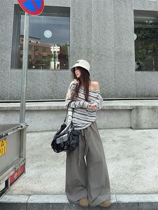 乌77韩系条纹一字领斜肩防晒T恤女2025夏慵懒感收腰显瘦长袖上衣